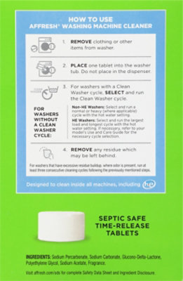 The ingredients are septic safe and wont harm washing machine. Here is a list of ingredients in each affresh product so you can make decisions for yourself and your family. Affresh Appliance Care Is Committed to Cleaning What You Cant See.